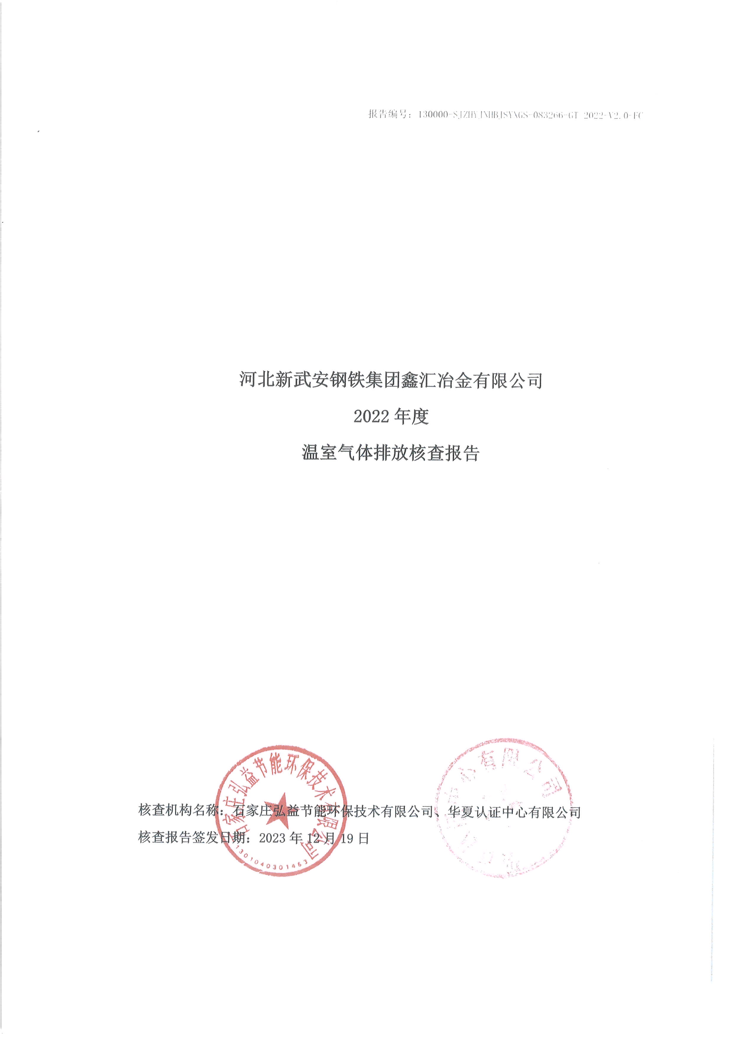 2022年河北新武安鋼鐵集團鑫匯冶金有限公司碳排放核查報告